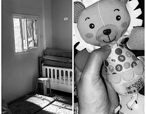 Today, Mohammad, my husband, went to check on the house and the damage incurred in the last shelling. He first went into our beloved baby Sofia’s room, the little birdy of my heart. I kept her toys and clothes, and her oxygen concentrators that gave me a few additional months of her life… and the memory book that I had started for her since the first day she lived inside of me! I insisted on going to check on them everyday, and smell her in them. Today, Mohammad went to find nothing in place! A shattered window. Dirt and sand filling up the place. When we fled the house, I could take nothing except her favourite toy with me. That toy is always with me, even in my normal days, inseparable from me.